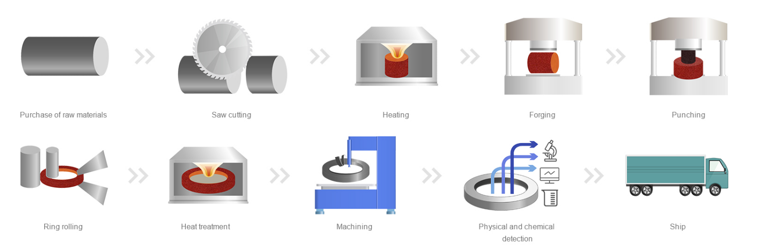 工装——材料——材料切削——材料加热——锻造——热处理——喷砂抛光——数控加工——理化检测